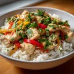 Finally, fluff the coconut rice with a fork and serve it in bowls. Top each bowl with the chicken and vegetable mixture. Don’t forget to garnish with fresh cilantro for that extra pop of flavor and color. Your Coconut Chicken Rice Bowl is now ready to be enjoyed!