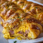 A delightful and indulgent breakfast casserole made with flaky croissants, creamy eggs, and savory deli meats.