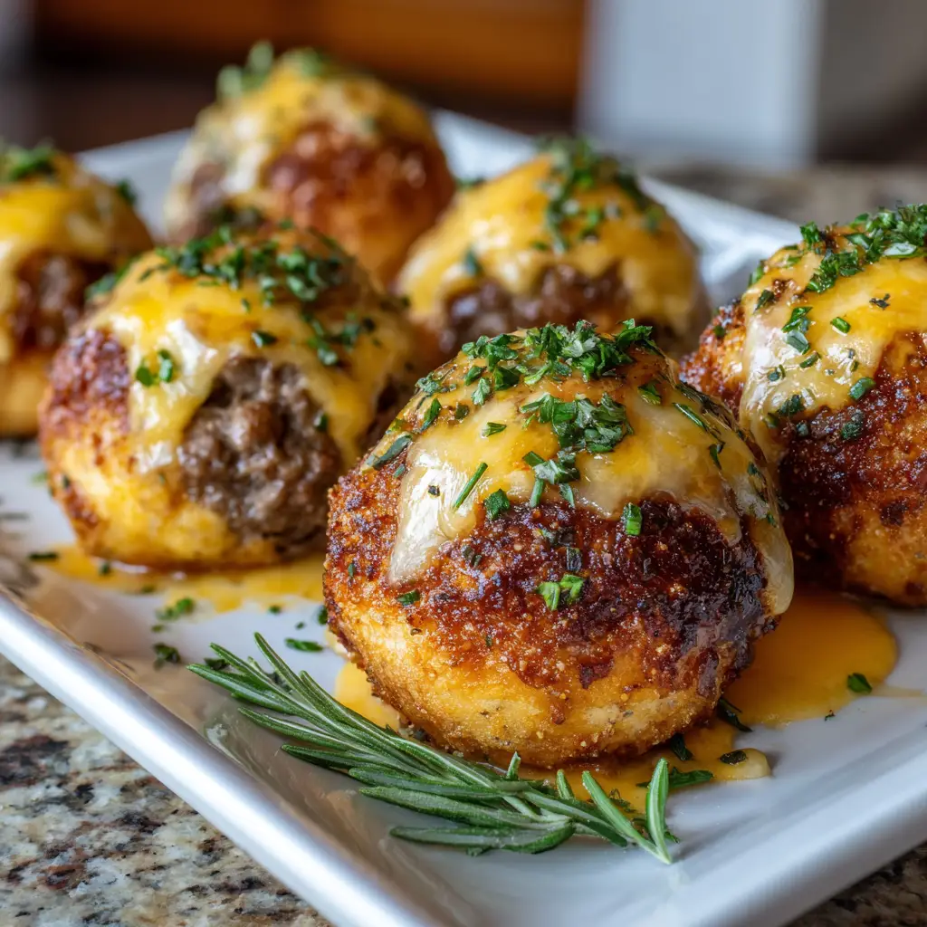 Garlic Parmesan Cheeseburger Bombs are delicious, bite-sized treats filled with juicy cheeseburgers and topped with a savory garlic parmesan butter.
