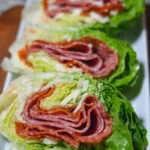 These Italian lettuce wraps combine spicy pepperoni, savory salami, and creamy smoked Gouda cheese, all wrapped in crisp iceberg lettuce for a refreshing and flavorful meal.