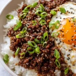 A comforting and flavorful Korean Beef Bowl featuring savory ground beef served over fluffy rice, garnished with green onions and sesame seeds.