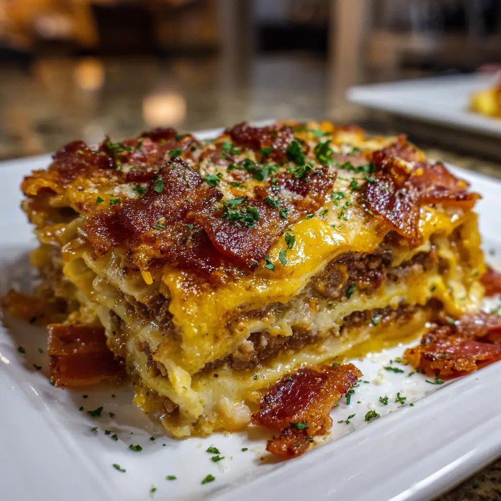 A delicious twist on traditional lasagna, combining the flavors of a cheeseburger with the richness of bacon and the savory taste of garlic.