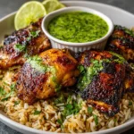 A delicious and vibrant dish featuring tender chicken served over flavorful rice, complemented by a zesty green sauce.