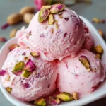 A luxurious and creamy rose pistachio ice cream that combines floral sweetness with nutty crunch, perfect for summer days.