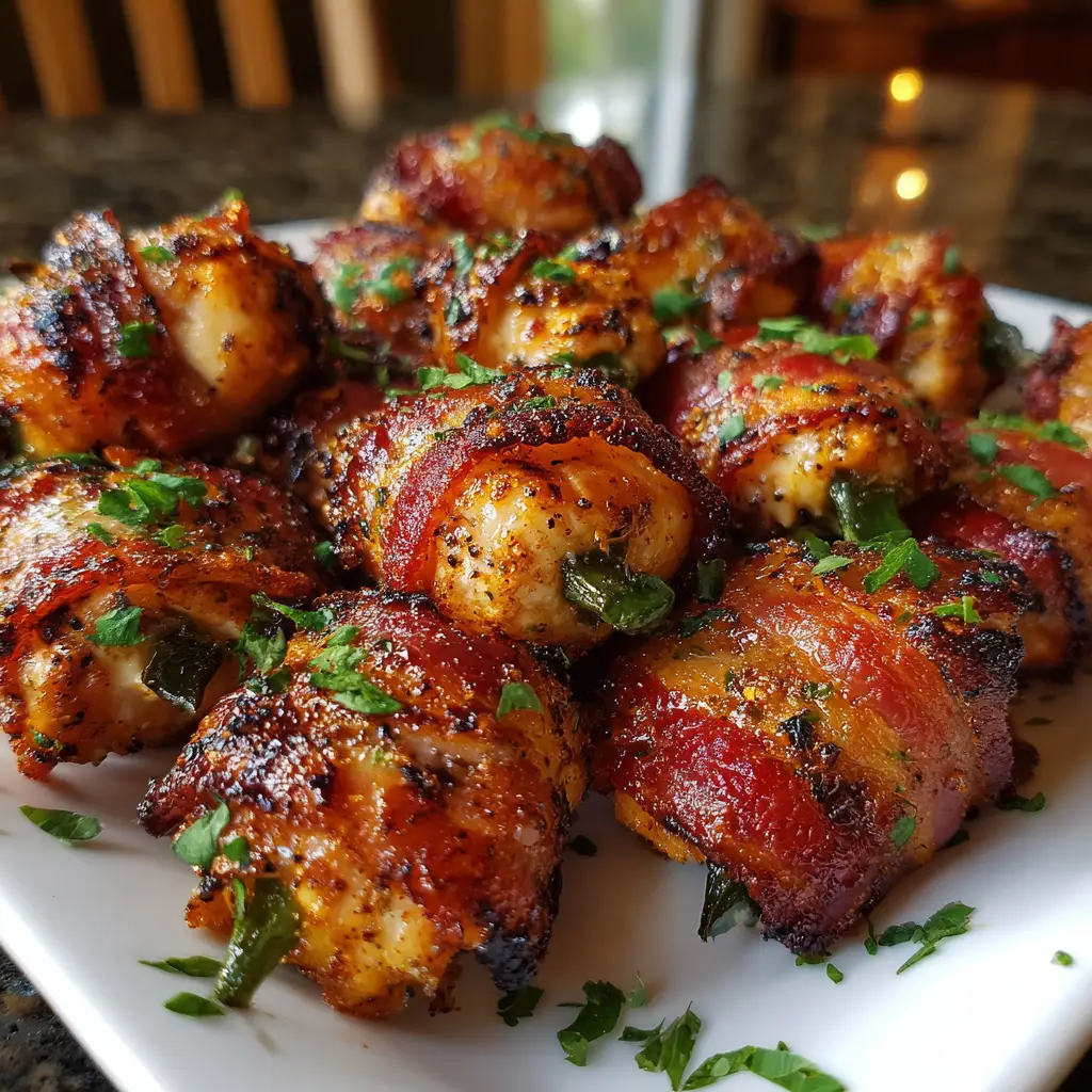 Delicious and spicy chicken bites wrapped in crispy bacon, perfect for appetizers or game day snacks.