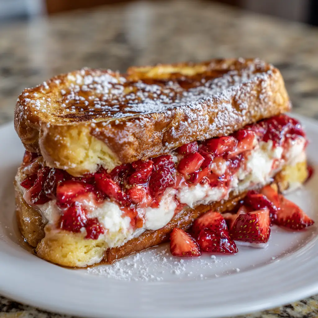 A delicious and indulgent breakfast treat featuring French toast stuffed with a creamy strawberry cheesecake filling.